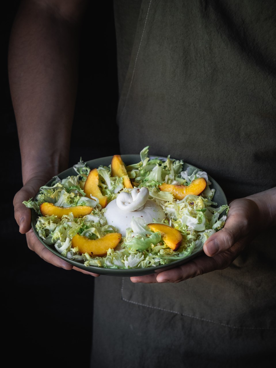 Esta ensalada de escarola, melocotón y burrata con un aliño único, será una de tus recetas de verano favoritas.